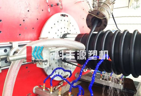 由于PE雙壁波紋管多是大口徑型規(guī)格,擠出成型用原料較多,所以一般廠家都采用雙螺桿擠出機(平行或錐形雙螺桿擠出機均可應(yīng)用),PE雙壁波紋管成型過程主要經(jīng)過管材成型,管材切斷和擴口等三個工藝流程,具體如下